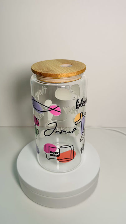 Este hermoso vaso de cristal combina fe, color y significado en un solo diseño. Decorado con ilustraciones cristianas modernas y la palabra Jesus, este vaso es un recordatorio diario de vivir con fe, amor y propósito. Sus detalles en tonos suaves y vibrantes crean un equilibrio visual que lo hace único y especial.